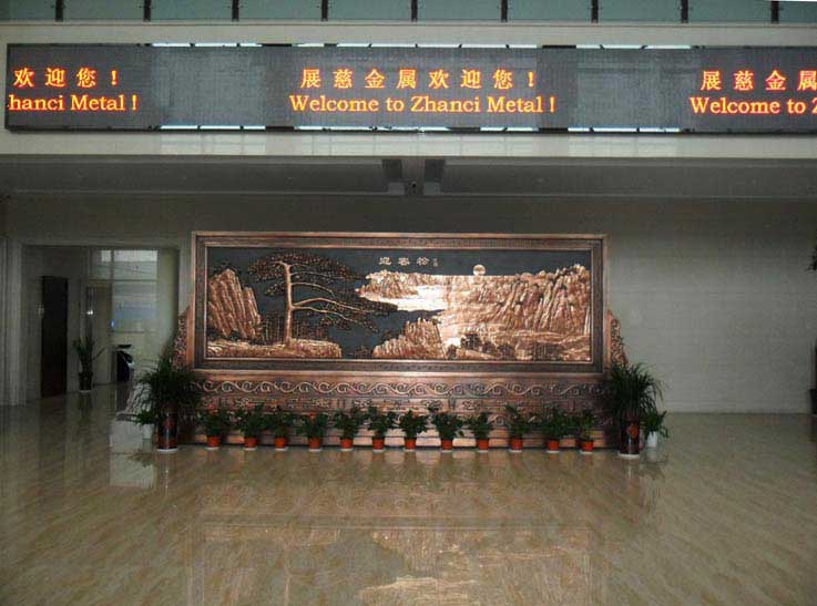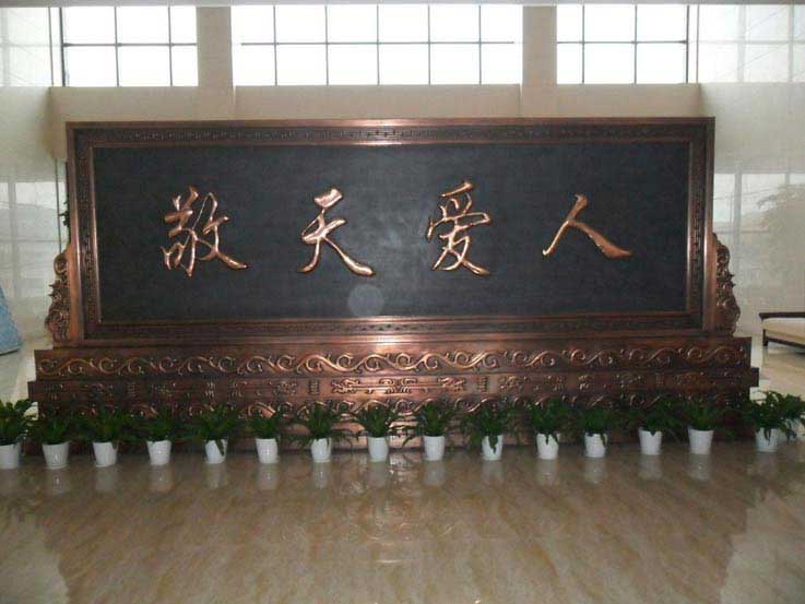 宁波展瓷金属工业有限公司定做的5.8x2.6米迎客松、敬天爱人全铜屏风