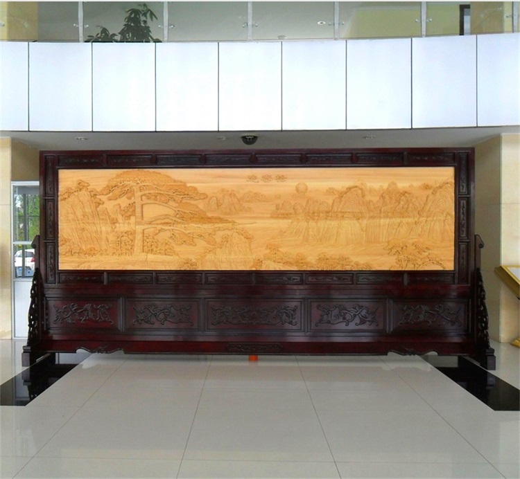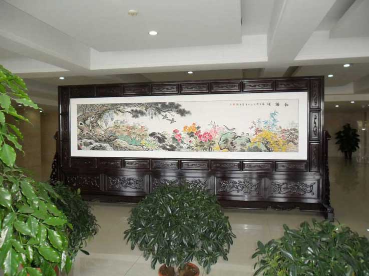内蒙古 锡林郭勒盟某单位大楼摆放的5.38x2.48米 木雕迎客松、国画和谐颂