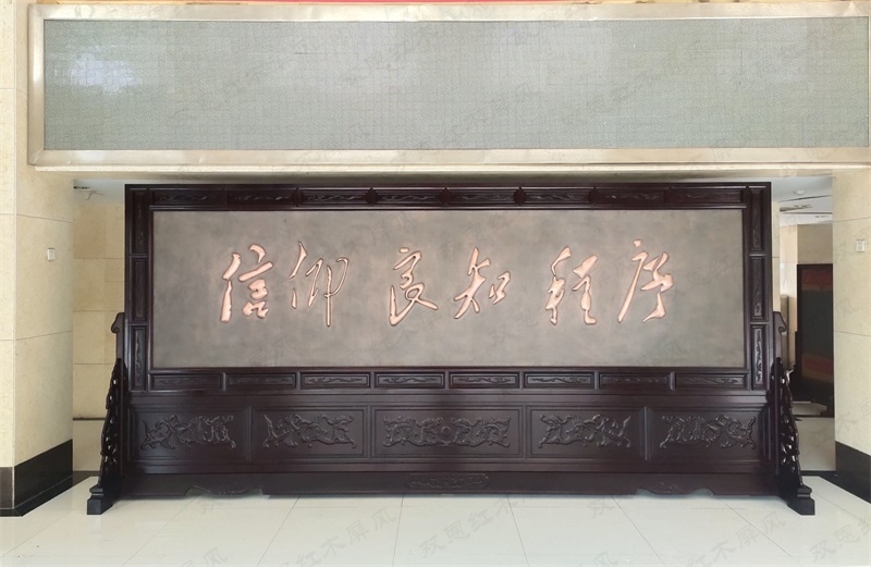 山西临汾侯马某单位5.2米×2.38米信仰、良知、程序、祖国颂红木紫铜浮雕屏风
