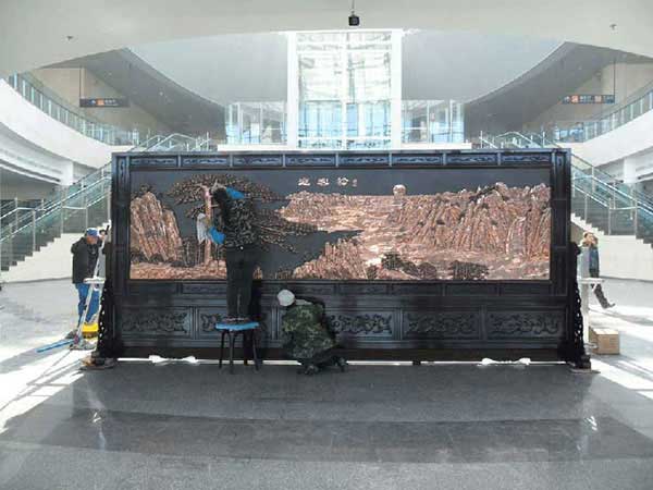 黑龙江哈尔滨某单位大厅摆放的5.8x2.6米迎客松,万里长城屏风